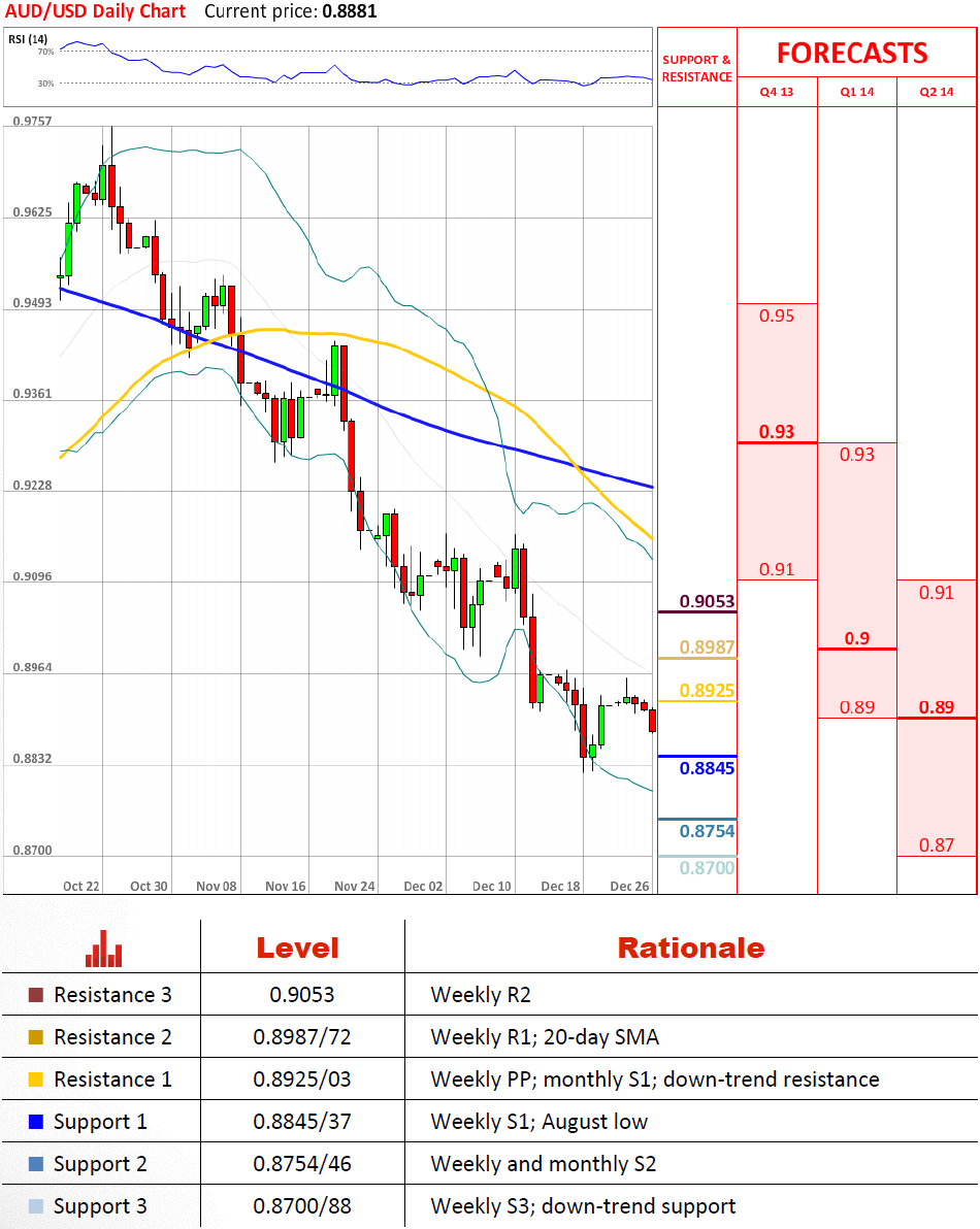 鉴于阻力位在0.8925/03否认了澳元兑美元尝试进一步上涨,空头通道(自从2013年10月以来的合适位置)保持它的主题性。因此,这种大量的上升有在图表上出现新低的可能性。这种下跌也可能扩展通过月第二支撑位0.8746并且到达0.8700/88,下降通道的下边界。