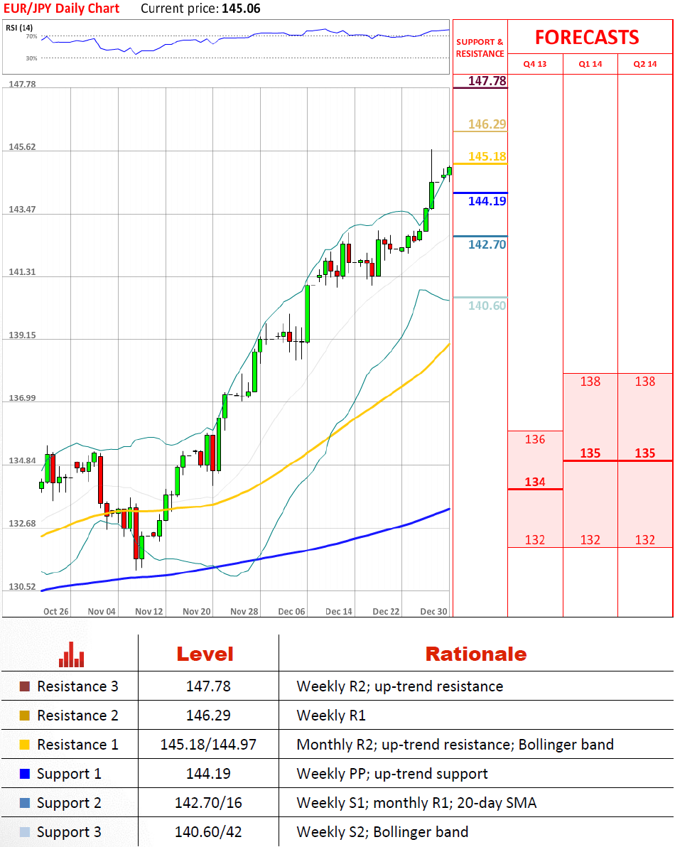 连续两个交易日货币对仍然受到来自上方145.18/144.97的强大阻力位和来自下方稍微弱势的支撑点144.19的控制。因此,货币对尽管长期看涨,被预计进行深度调整,可能下跌到2009年高点,在主要上升趋势阻力线之前目前在这里交易。