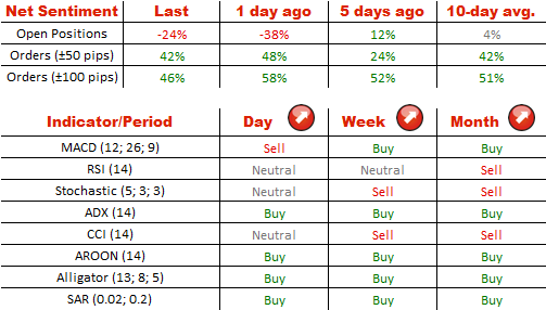 美元兑日元的情绪并不像在星期二那么悲观,当时69%的仓位是做空的;但仍有显著的数量差异在多头(38%)和空头(62%)之间。尽管最近多头和空头之间的比率大幅波动,但是大部分的订单是买入的-73 %。