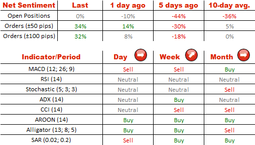即使刚刚五天前有三倍多的空头头寸相对于多头一边,但是现在他们的份额是平等的,因此英镑兑美元的情绪是中性。关于订单,明显有更多的计划去购买英镑(66%)相比于卖出它(34%)。