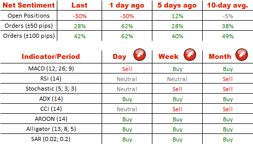 美元兑日元多头和空头仓位之间的分布与上周相同,当时65%的交易者认为美元将会升值而35%会有另外的情况。对于靠近现价的订单,买入的比例(71%)明显小于之前(81%)。