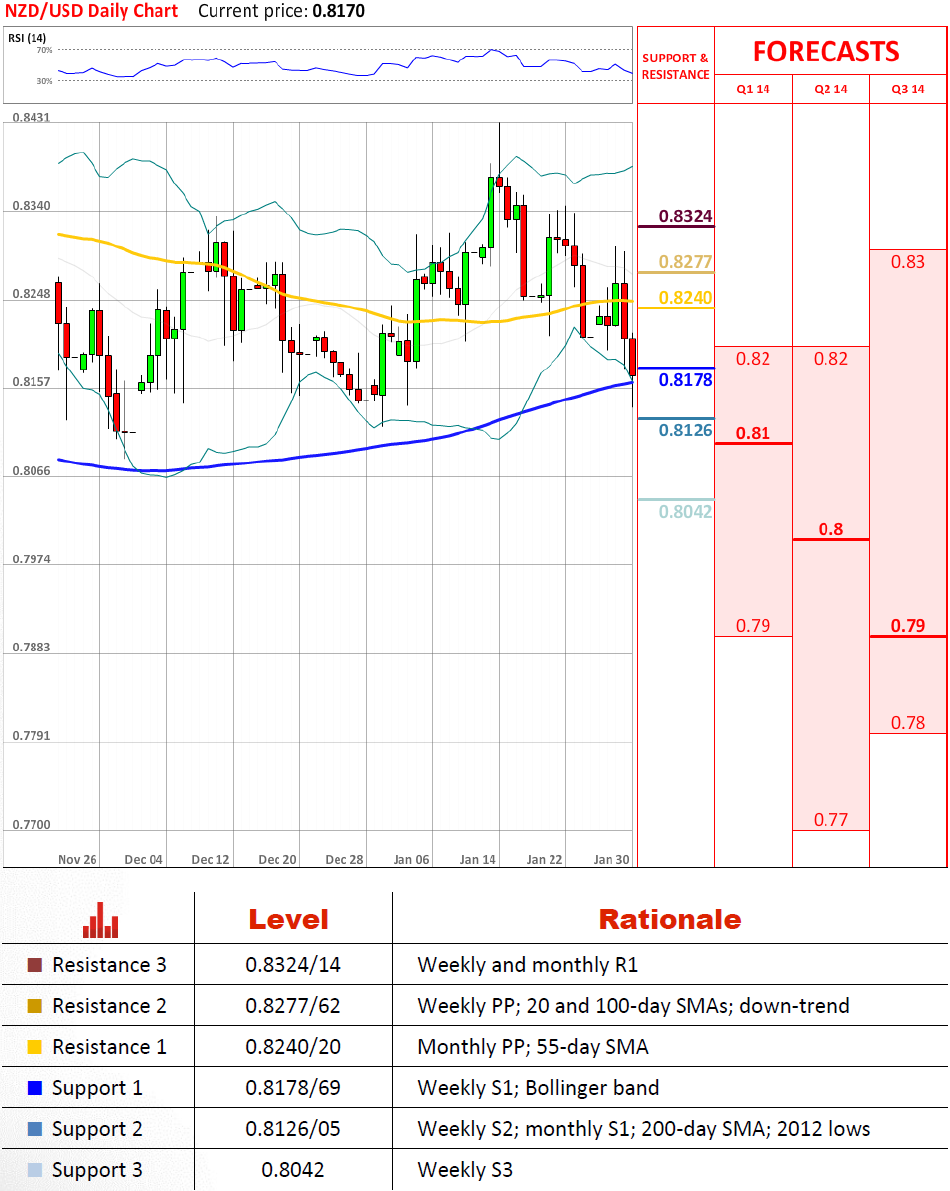 下行趋势阻力线,结合100日均线,没有让新西兰元任何进一步升值并且开始的下行已经突破了月枢轴位。因此,卖出压力可能持续直到汇率达到一连串支撑位0.8126/05,尤其是200日均线,月第一支撑位和下行趋势支撑线。