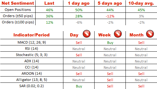 美元兑瑞郎的多头和空头之间的分布是最稳定的一个-看涨情绪对于美元是利好消息,昨日(73%仓位做多)。在现价100点内的订单份额,56%买入而44%卖出美元。