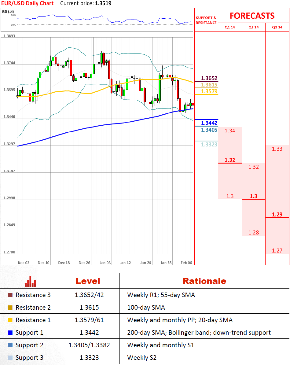 货币对走势更接近月枢轴点了一些,但仍承受相当大的下行压力。欧元兑美元因此应该会尽快重新测试需求区域在1.3442,该区域主要由200天均线和两个月的下降趋势支撑线构成。但最终,它应该会放弃,从而打开通向1.32的大门。