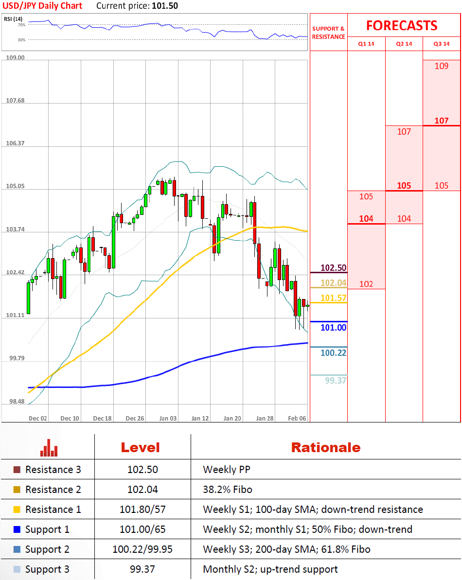 现在美元兑日元交易在下降楔形模式的上边界。有可能货币对会突破阻力在101.80/57,则美元将可能会大幅升值,可能的喘息只有在接近月枢轴点和斐波那契23.6%水平位在103.34/102.96。下一个目标将变成一月高点105.43。