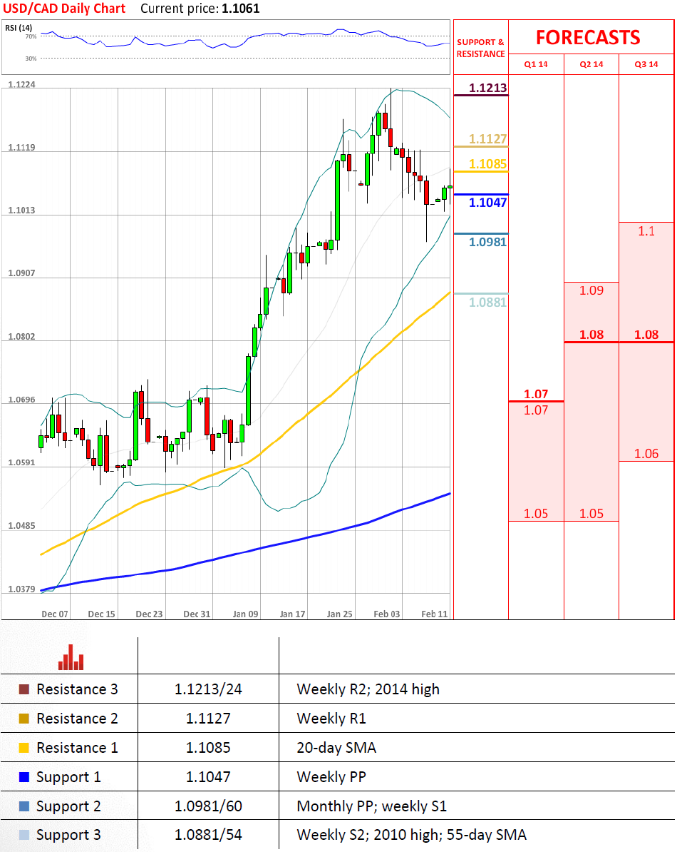 货币对表面上重新获得看涨偏好,但没能获得势头并且目前稍微在20日均线下方巩固。似乎近期的抛售是1-2月上涨的看空修正。在这一点很难去预期很快有完全承诺的上涨。即使它发生,2014年高点可能推动货币对让步。总之,货币对非常有可能在1.11下方徘徊很多天并且之后开始升值。