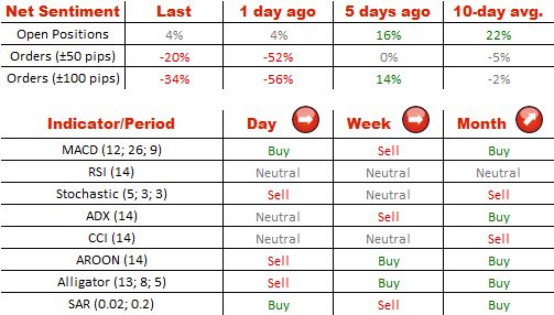 目前,市场参与者看涨(52%)和看跌(48%)数量几乎平等,意味着交易者的情绪目前是中立的。同时,有足够的数量(67%)的卖单在货币对上,尽管他们的份额自从之前的报告以来(来自78%)已经减少了。