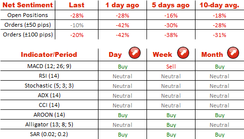 虽然货币对昨天下跌近100点,但是欧元兑美元的情绪保持与24小时之前完全一样-36 %的仓位是做多,他们中64%是做空的。同时,卖出订单的部分下降,从71%下降到60%。