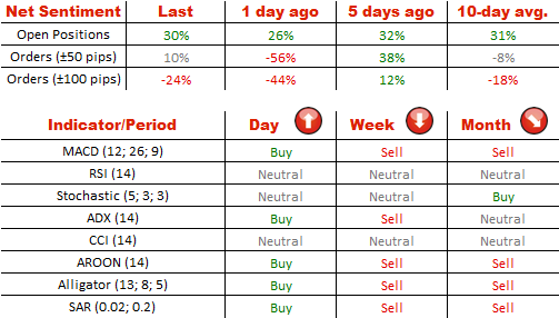关于澳元情绪一夜之间稍微改善了,因为做多仓位从63%增加到65%。至于订单,卖单比例在下跌,从72%下降到62%,表明阻力位附近正在减弱。