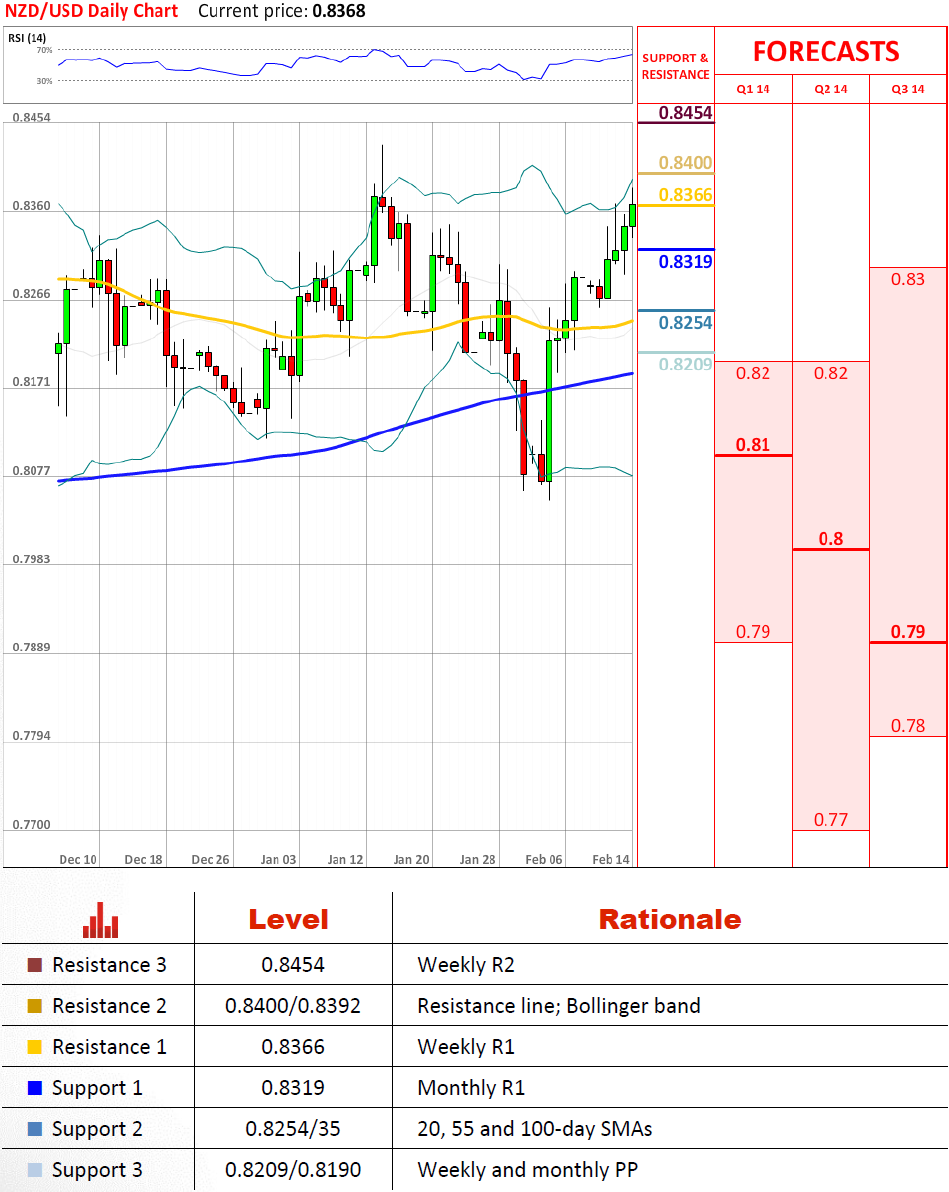 新西兰元兑美元似乎有可能公布第二周大量的收益,因为所有的阻力位遇到未能暂停提升。这种强劲的恢复由测试2012年低点导致,当二月初货币对在接近0.81触及最低点。现在货币对被预期挑战0.84,有可能确定下一个终点价格。