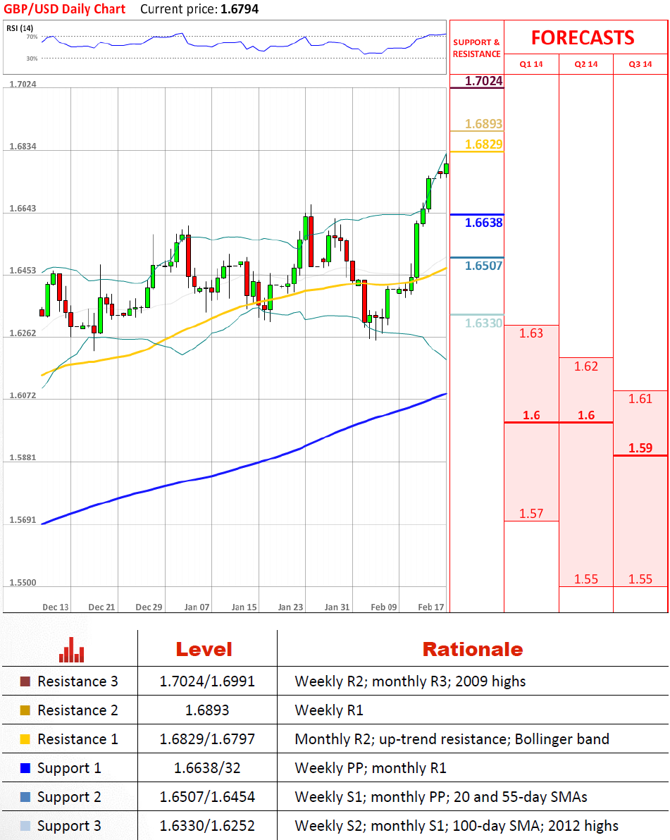 英镑兑美元目前正在测试由月第二阻力位和长期上升趋势线产生的阻力。然而,现在这个强大的供应区域似乎并没有对它继续推进货币对产生显著的效果。如果英镑兑美元没有停止在1.68,2009的高点和月第三阻力位在1.70可能发挥作用。