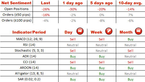 看跌交易者在SWFX市场优势已变得不那么明显,因为他们的仓位从65%收缩至63%。然而,整体的情绪相对于英镑兑美元是负面的。同时,卖出订单的百分比在现价50点内已从51%增加到63%。