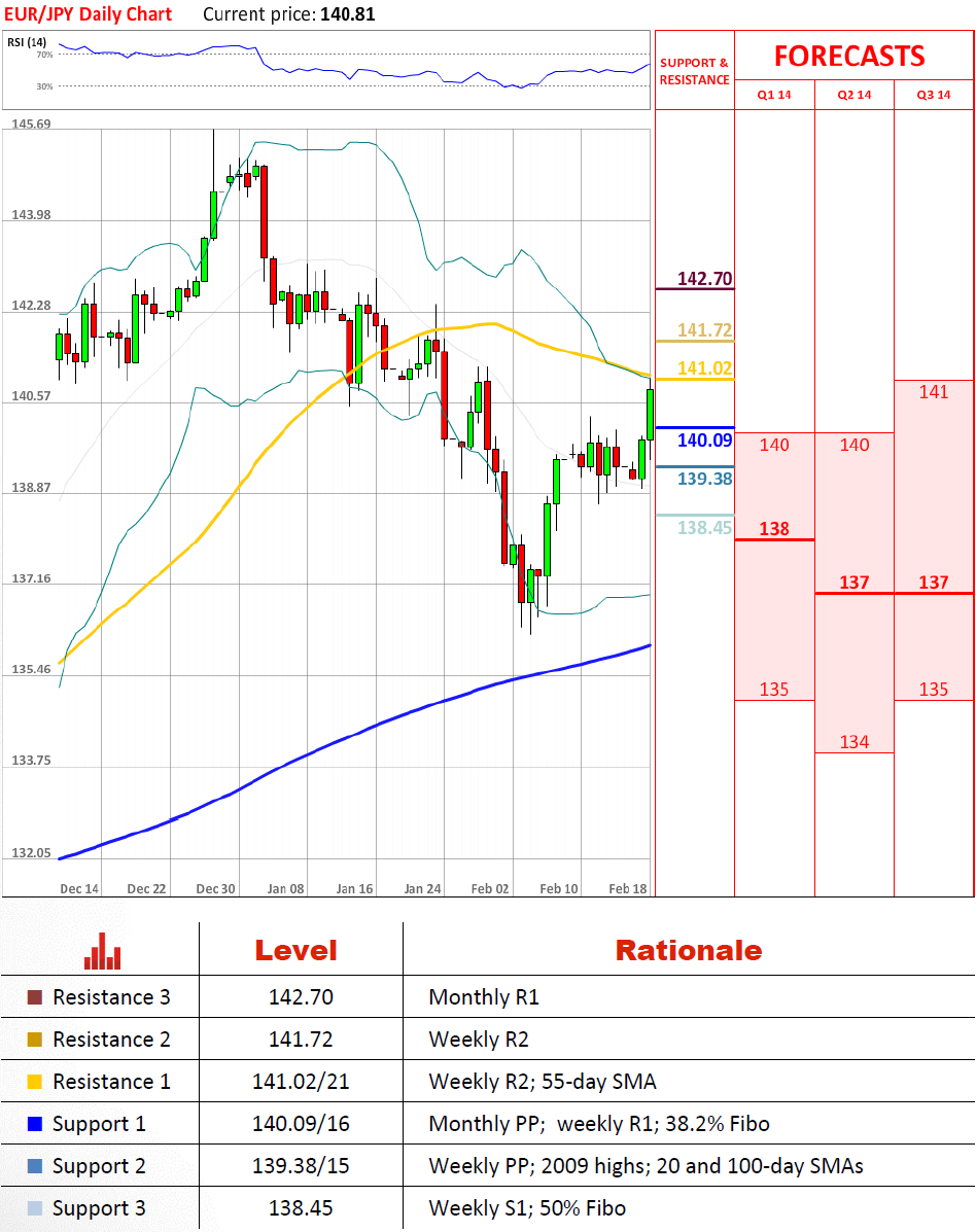 货币对削弱了140日元附近强劲的阻力位并走强。目前它正在测试周第二阻力位/55日均线以及我们预计它将不会保持甚至最初的测试。货币对应该甚至进一步扩展它的收益并且在中长期测试142.70。一些短期看跌可能被预计在141.72附近。万一出乎意料地失败了货币对可能跌回140日圆,但应该在139.38/15找到支撑。