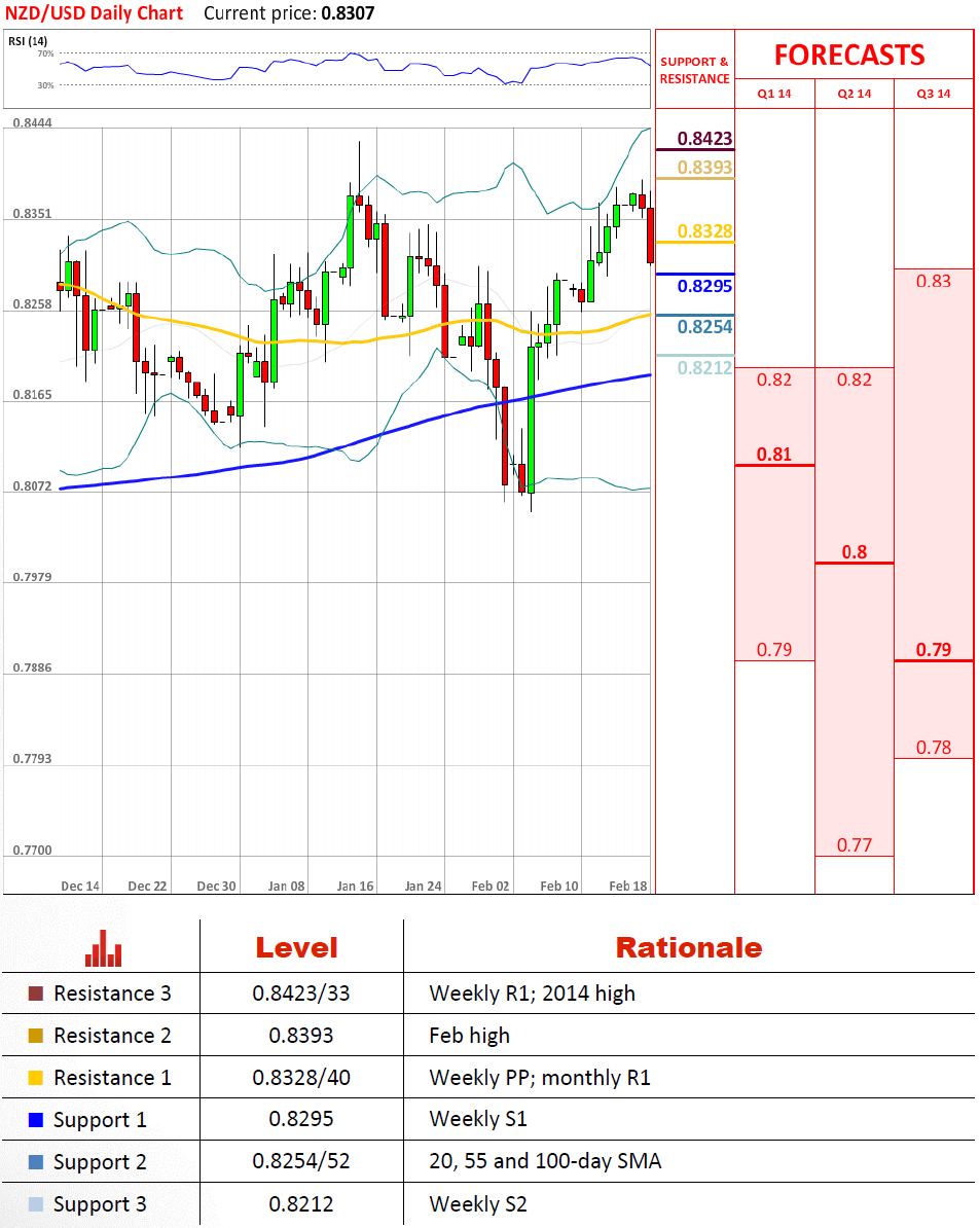 货币对回调并且最终没能在2014年高点之前形成2月高点。我们预计一些周第一阻力位的看涨,但20,55,和100日均线被预计在中长期测试。跌破它可能触发强劲的看跌行为并让货币对直到81美分,是主要市场参与者本季度平均预期价格的位置。进一步升值似乎目前极不可能。