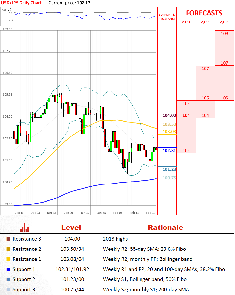 美元兑日元达到最高点102.74之后回到了支持区域,该区域主要是由100天均线和十一月-十二月上涨期间的38.2%斐波纳契回撤水平构成。 即使指标总体上的信号是混合的,但是有一个很好的机会,美元将继续走在长期看涨的路径上。