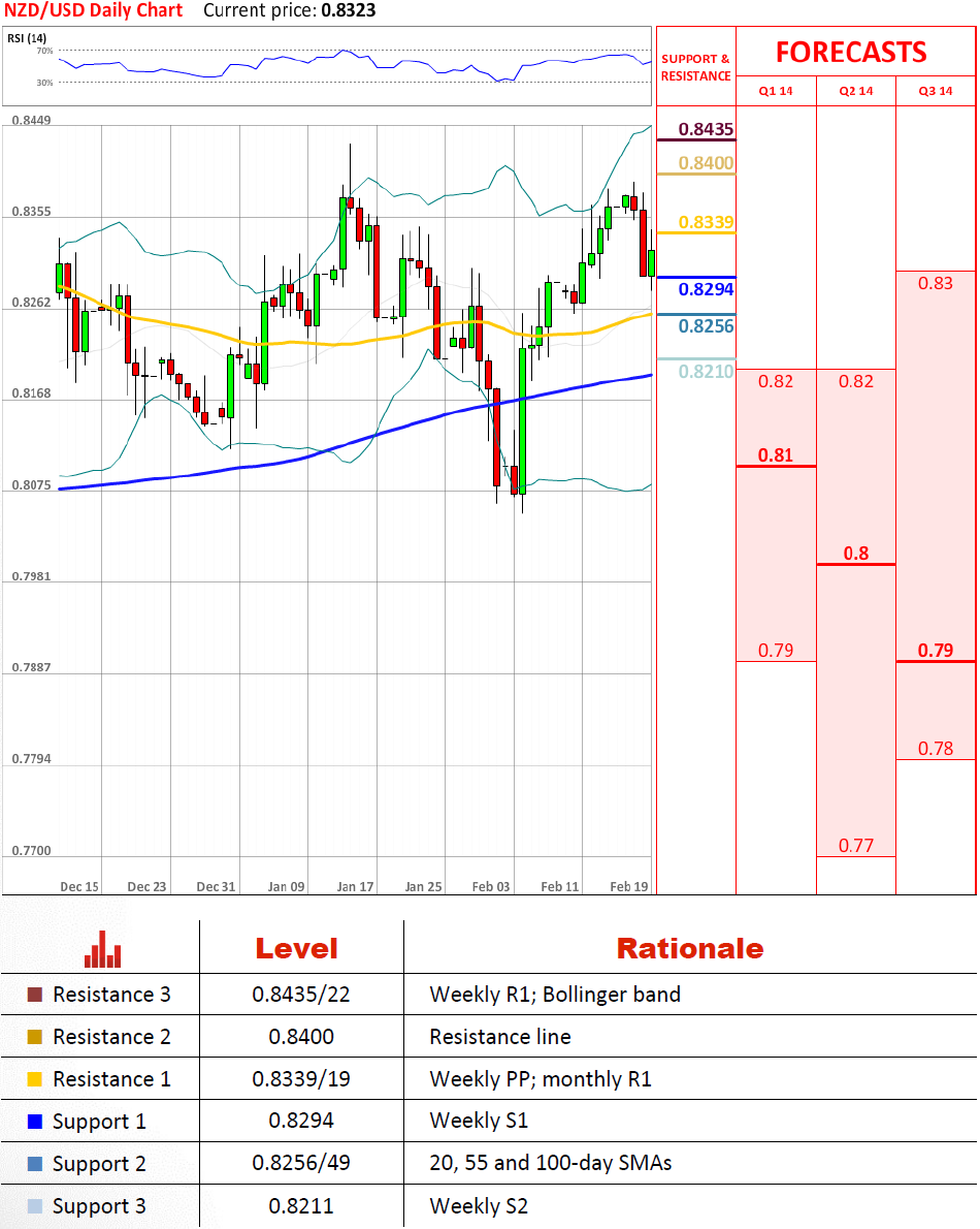 通过今天的价格走势判断,新西兰元兑美元似乎不愿意放弃突破0.84,历史上已经被证明是相当重要的关口,如果我们看看自从去年9月发布的高点。现在周第一支撑位足以保持货币对的波动,但大多数国际银行的预测暗示 汇率被预计本季度移向0.81。