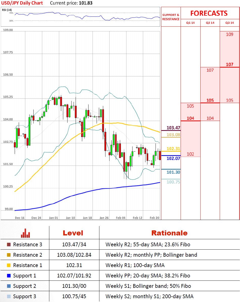 昨天美元兑日元并没有设法停留在100日均线和周第一阻力位之上,现在空头正在推动货币对走低,朝向斐波纳契38.2%回撤水平。假使需求区域在102.07/101.92最后失守,将仍然有强大的支持留在101和100之间,该位置极不可能让价格跌的更低。