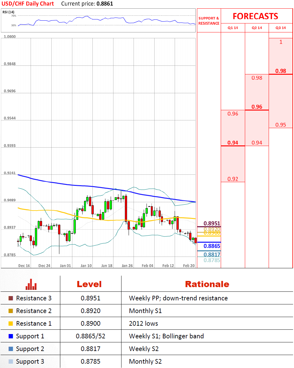 经过一次由周第一支持位形成的短暂的向上修正之后,美元兑瑞郎现在似乎准备继续下降,应该会向下延伸到0.8730,长期下降趋势线位置。技术研究同样暗示这种情况,但同时我们应该意识到那里有一个潜在的强硬支持位在0.8785-月第二支持位。