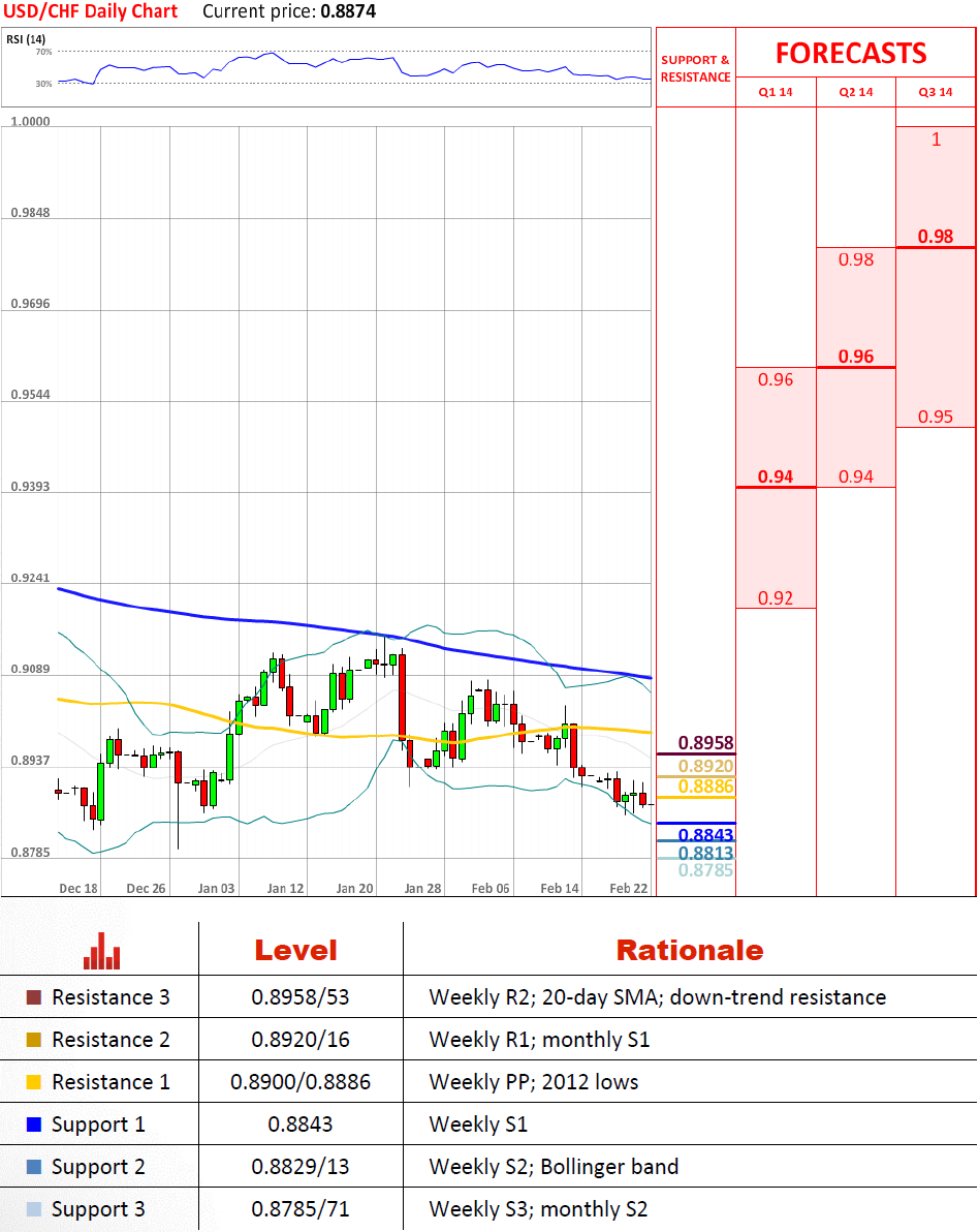 考虑到美元兑瑞郎最近已经跌破了0.89,因此更可能会继续下行。 最近的支持是周第一支持位在0.8843,而更严重的需求区域在0.8785/71,主要由月第二支持位构成。如果货币对通过这一需求区域,接着它将会测试长期下降趋势线在0.8730,该位置应该会启动反弹。