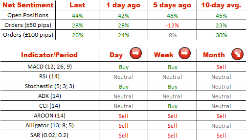 美元兑瑞郎保持强大而稳定的乐观情绪,因为此刻72%的交易者认为美元会比瑞士法郎做的更好。同时,买入订单的百分比很大程度上也是不变的,它保持在63%(上周62%)。