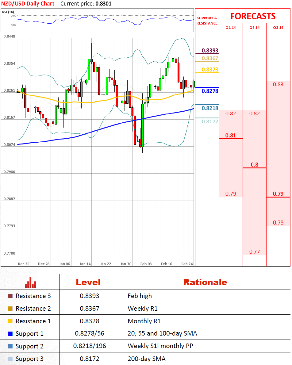 货币对继续在一连串均线0.8278/56附近徘徊。它可能为货币对提供看涨冲力并且推动它在不久的将来测试2月高点,但是,想到近期的发展,目前似乎更不可能。跌破这些均线,然而,更有可能触发一种主要的抛售直到0.8172。