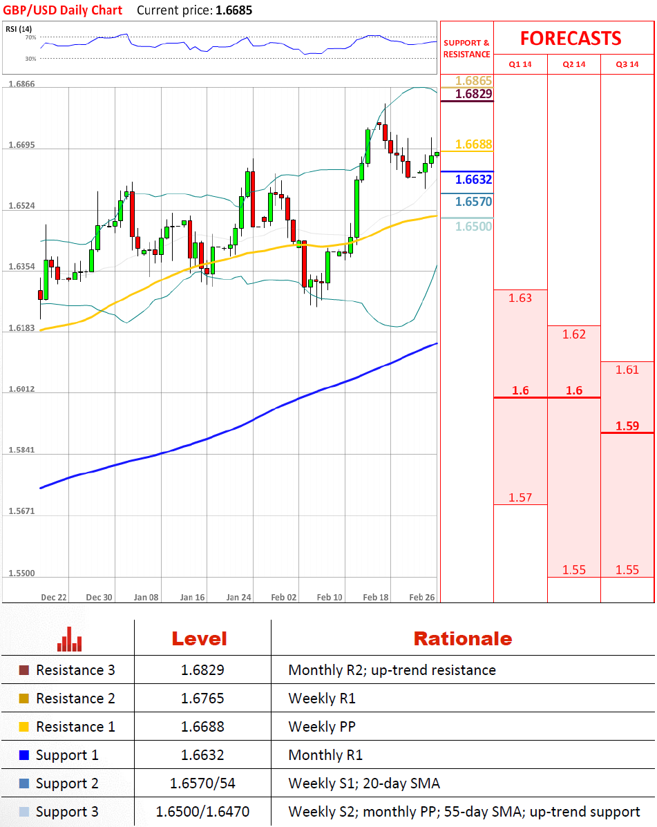 昨天英镑兑美元试图突破周枢轴点,但是,正如预期的那样,在1.6688以上未能获得立足点。因此,这是一个很好的机会英镑兑美元从这里滑落到月第一阻力位在1.6632。然后它会在1.65重返上升趋势的支撑线,该位置最后应该会屈服于抛售压力,从而让货币对走出上升楔形。