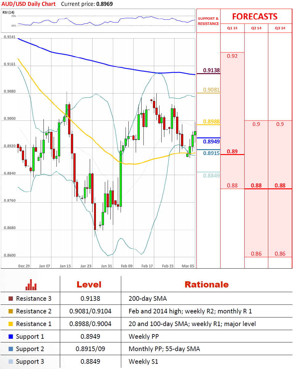 货币对持续攀升得更高,今天峰值稍微在标记的90美分上方。我们应该看到对于货币对的另一种尝试,巩固很快超过标记的90美分,对于本季度是主要市场参与者中间价格预期的位置。峰值超过90美分将放入2月和2014年高点。