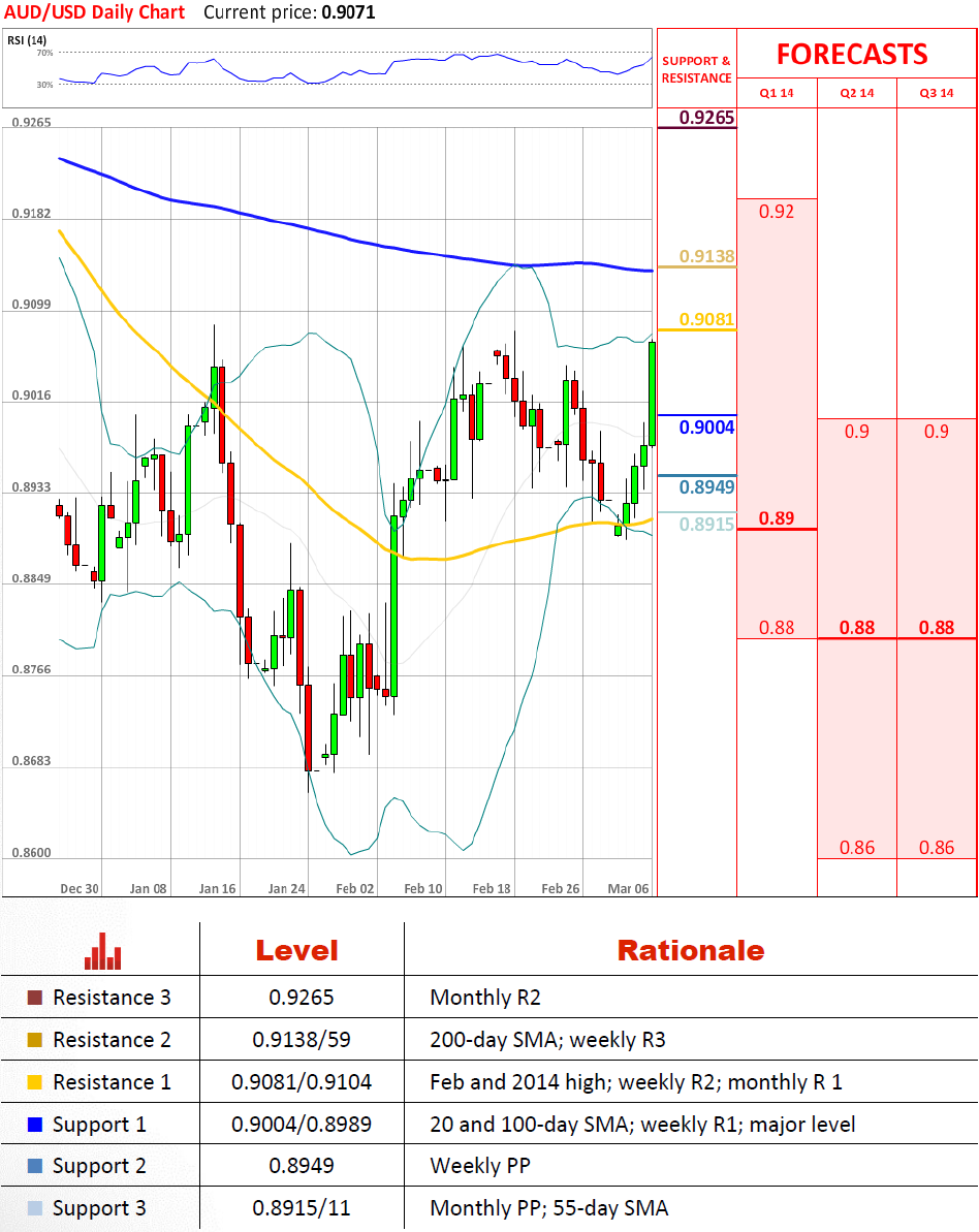 在几次尝试之后货币对成功地削弱至阻力位90美分,目前正指向标记的91美分。我们应该至少看到最初的失败在这里,2014年高点是太强劲的心理关口以至于不能轻易放弃。货币对的多头能力推动它达到新高,在中长期而言也是有问题的。支撑的信号来自于技术指标。