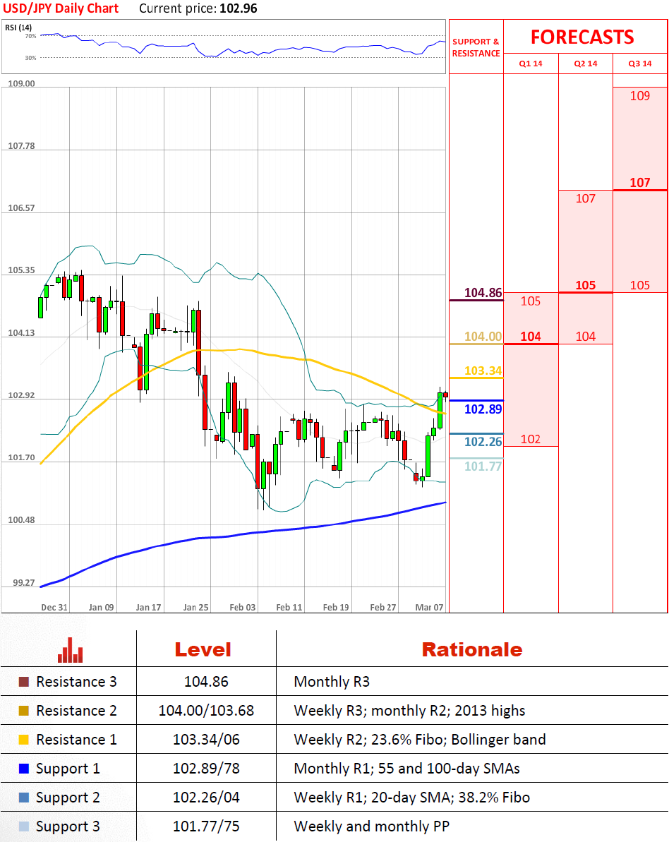 美元兑日元昨天毫不费力地刺穿并通过了一连串阻力在102.89/78。现在,55天和100天均线也已经被违反,因此价格正准备挑战下一个障碍在103.34/18,包括周第二阻力位和斐波那契23.6%水平位。然后,如果乐观的势头获得保存,2013年高点104将会受到攻击。