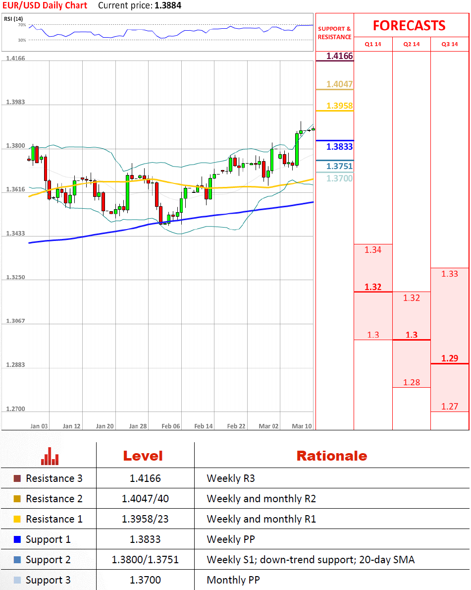 上周的走势,即突破1.38,为欧元兑美元打开了走向1.43,2010年高点的道路。 然而,从所有相关的时间框架的技术指标上来看,该货币对目前上涨势头是疲弱的。此外,目前面临着第一阻力位,这似乎不大可能让单一货币加快升值的步伐。