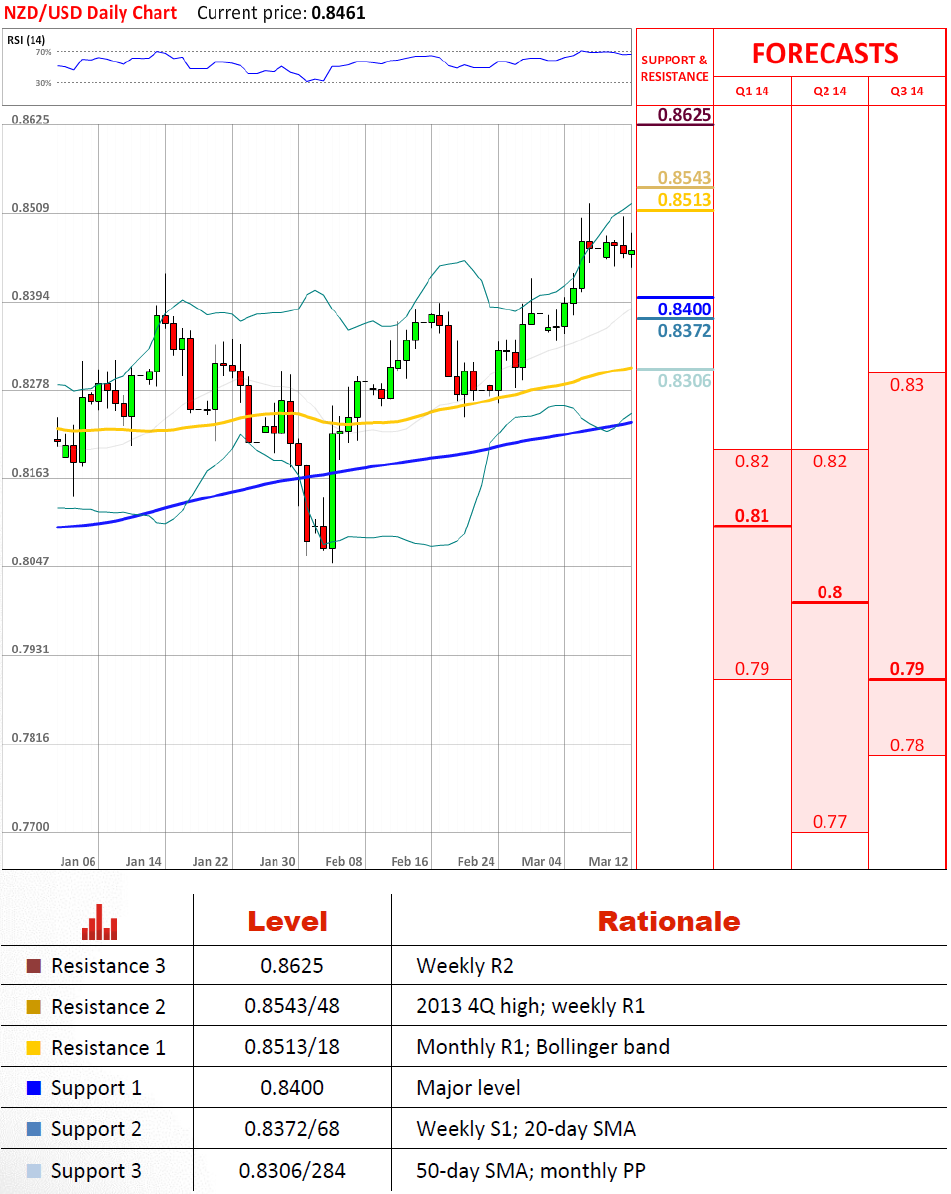 到目前为止,与前面一周相比,本周我们已经相对少的看到在新西兰元兑美元上的走势,当我们看到它在加强。今天它已经在周枢轴位0.8445附近交易,在昨天货币对找到一条强劲的阻力位0.8500之后。它可能受到一些信息冲击的影响,正如明天官员的会议;然而,我们预计它下跌至20日均线和周第一支撑位0.8372/68。