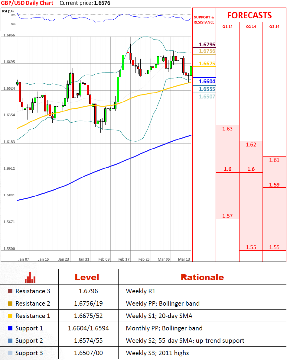 在1.66左右的一个强有力的支持区域支撑着货币对(月枢轴点,上升趋势的55日均线),英镑兑美元似乎倾向于上升。目前货币对正在测试阻力位在1.6675/52,假使英镑扩展涨幅,周枢轴点在1.6719将会承受在压力之下。但是从长远来看,我们仍预期,英镑将会表现不佳。