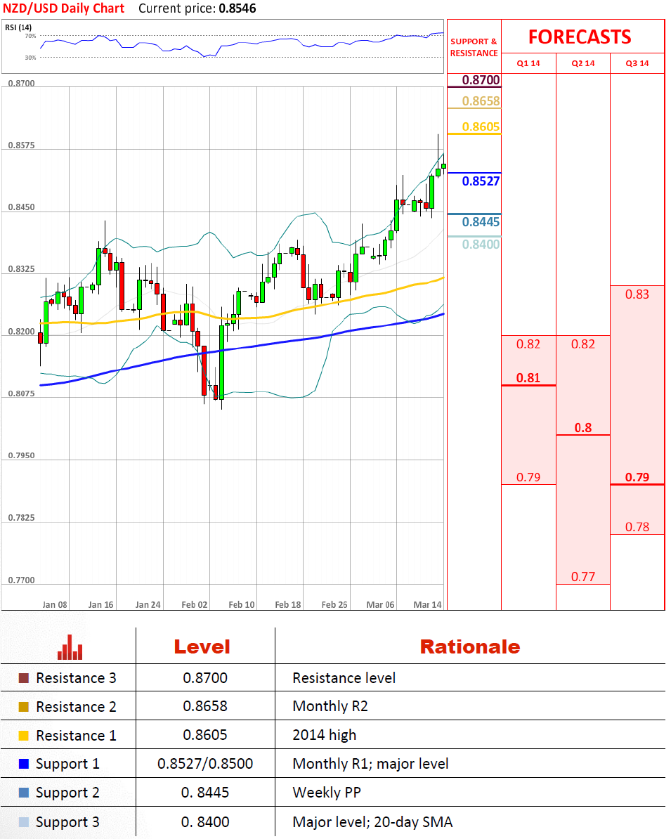 在过去两个交易日新西兰元给人深刻印象的提升之后,它开始做了一种修正并且当前在周第一阻力位附近和2013年第四季度高点(0.8548/43)附近交易。我们预计它将滑向周枢轴位0.8445并且进一步下跌至主要关口0.8400是可能的。技术指标发出复杂信号;然而,我们看空这个货币对。
