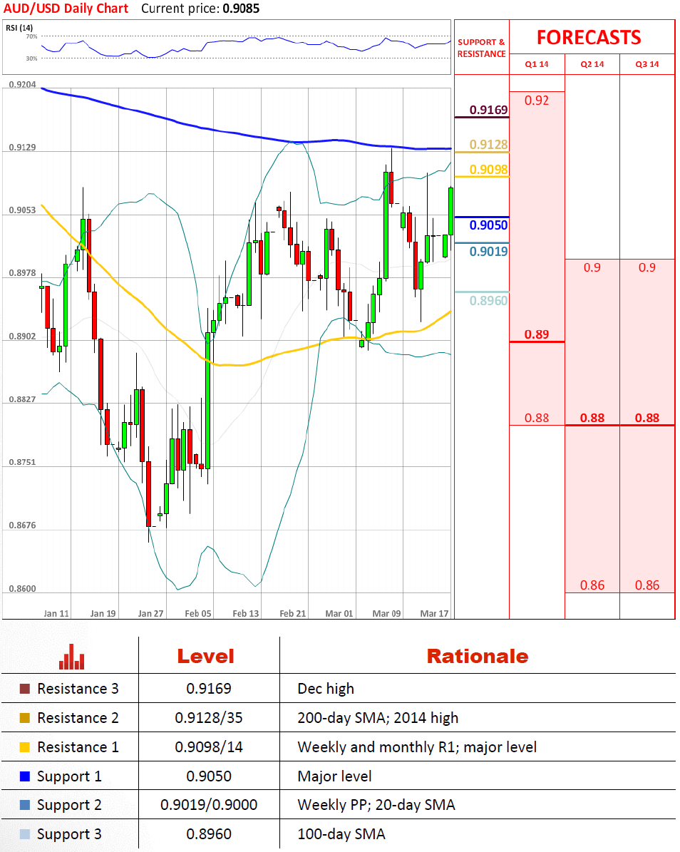 货币对本周开始在90美分,但攀升到高位并且目前在指向91美分关口,在上周在这里失败之后。我们不希望货币对提升超过它。至少不是轻易地,因为它可能不得不之后提升超过200日均线/2014年高点。在这些任何阻力位的失败是极有可能的,可能让货币对走向100日均线,但0.9019/0.9000应该让货币对停止并且导致它稍微在它的上方巩固。