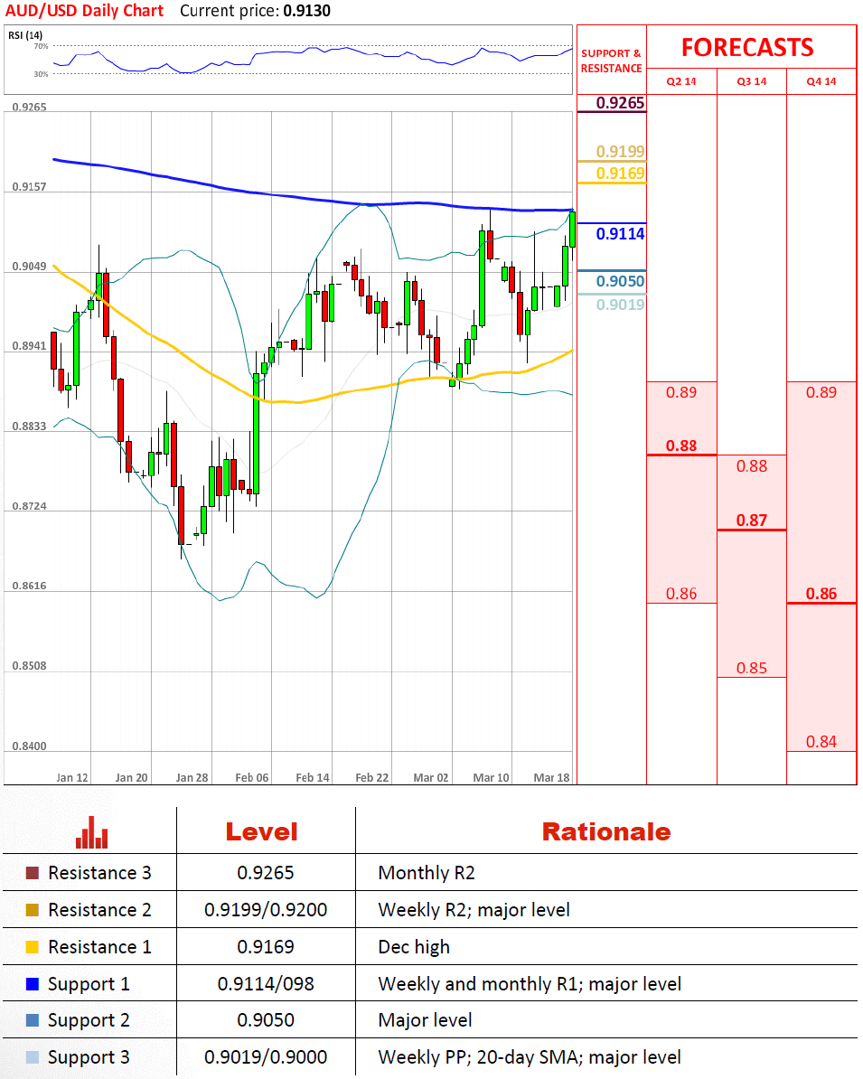 正如预期那样,货币对继续它的上涨,测试91美分附近的阻力位,似乎成功地在它上方巩固。如果在不久的将来(几个交易日)货币对不再撤回91美分下方,我们应该看到它攻击12月高点。然而,如果它没能维持在91美分上方我们应该看到它抛售直到90美分,如果看跌继续,直到近期低点在89美分附近。