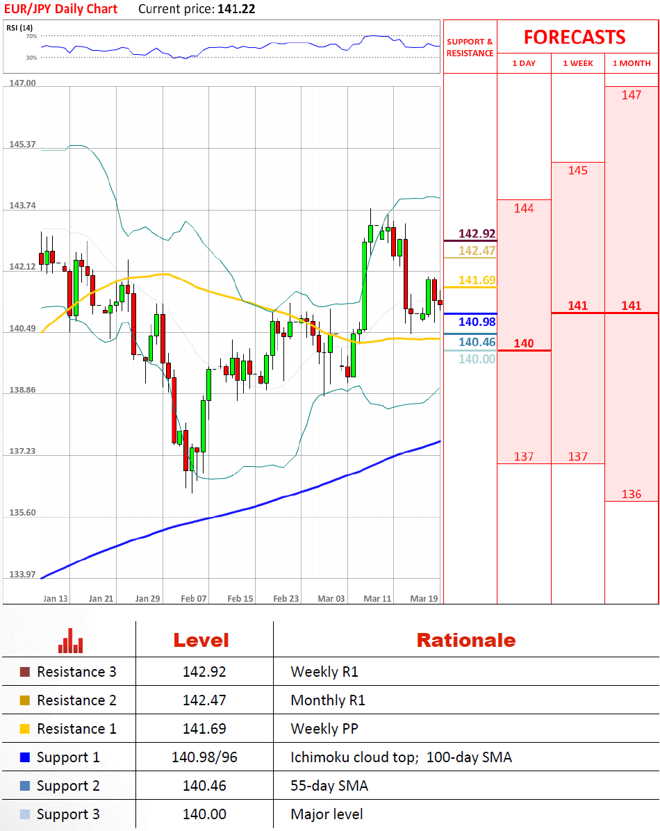 正如预期,货币对在141日圆附近巩固。我们预计这种横盘交易进一步持续,极有可能本周末结束。只有一种主要的移动,像峰值超过月第一阻力位或者跌破55日均线可能触发一种主要上涨或者抛售。万一任何这些发生,我们可能看到货币对攀升到3月高点144日圆附近或者抛售到2月和3月低点139日圆附近。