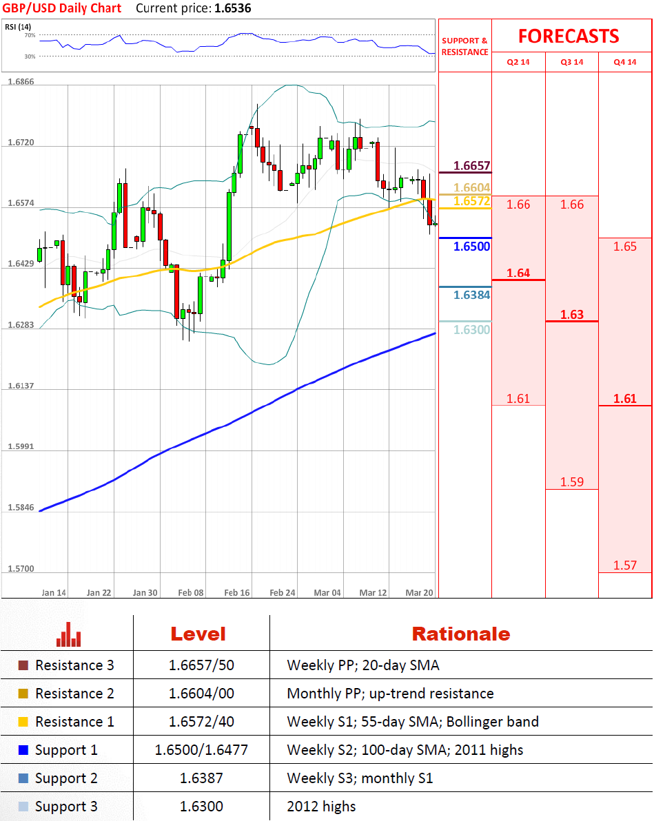 英镑兑美元终于离开上升楔形形态的边界,它起源于2013上半年,是一个强劲的抛售案例。关键支撑,即上升趋势在1.66,已经被破坏,只留下2011年的高点和100天均线在1.65暴露在外。如果英镑在那里没有停止,基于最近的走势这是一种可能发生的情况,价格将有望测试2012年高点在1.63。