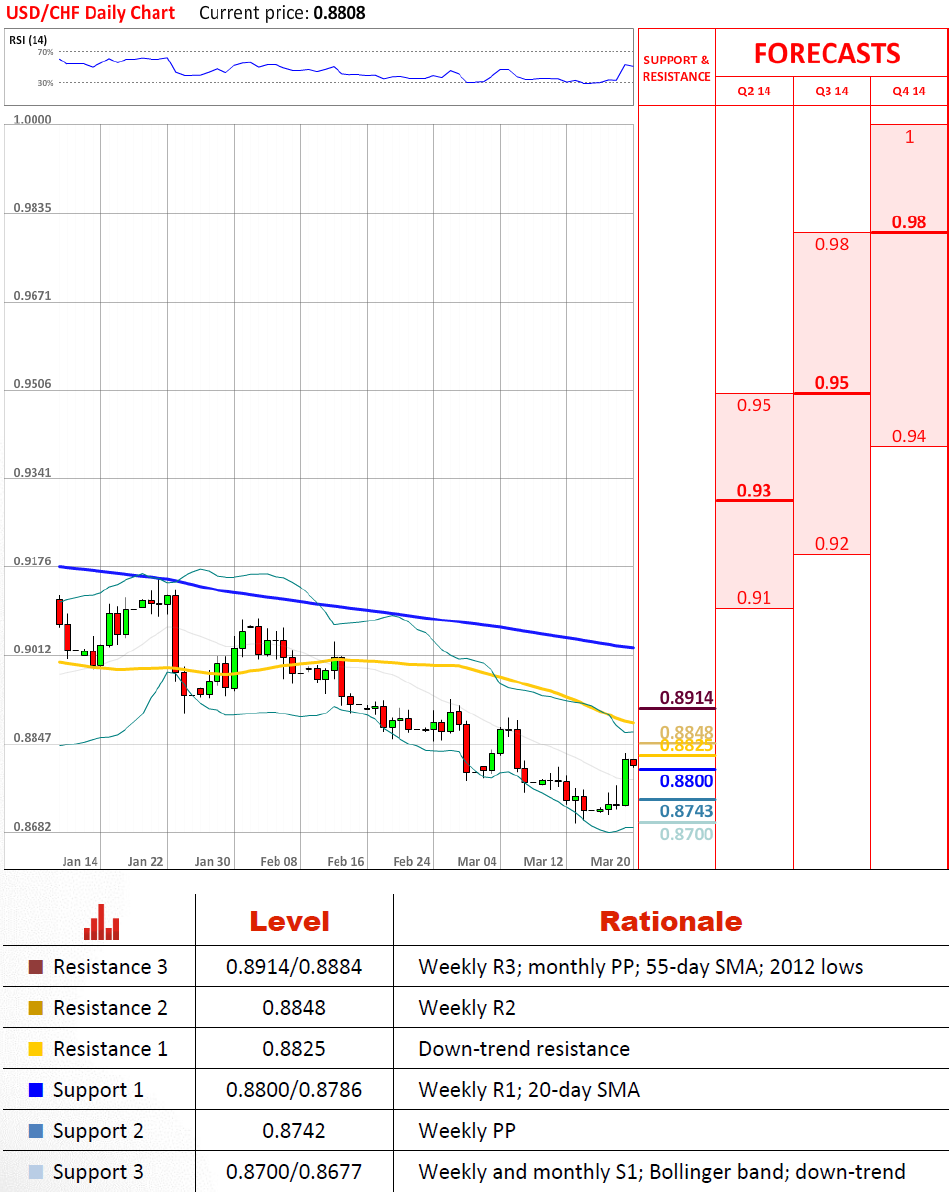 美元兑瑞郎最终达到下降楔形的上边界,意味着现在已接近于退出该模型并开始一个强大的长期复苏。然而,现在阻力位在0.8825被证明是相当坚实的,不准备让货币对进一步发展。因此,可能会有一个回撤至0.8800/0.8786,在美元展开另一次攻击之前。
