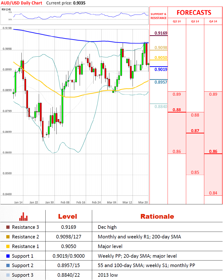 货币对没能在91美分上方巩固在昨天达到2014年高点之后,并且骤然下跌至90美分下方。目前它稍微在这个心理关口上方徘徊,但我们预计也会在近期至少有一些额外的看跌走势。应该让货币对稍微在0.8957/15下方区域,但不会在0.8900下方太多。