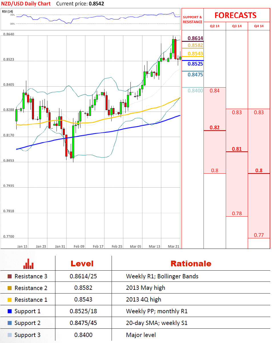 本周货币对一直在月第一阻力位和周第一阻力位之间波动;然而,目前在周一交易开始的地方。新西兰元兑美元强劲地受到周枢轴位和月第一阻力位0.8525/18支撑,给予货币对一些看涨冲力。我们预计稍微的升值朝向5月高点0.8582;尽管,如果月第一阻力位被突破,货币对可能下跌朝向20日均线和周第一支撑位。