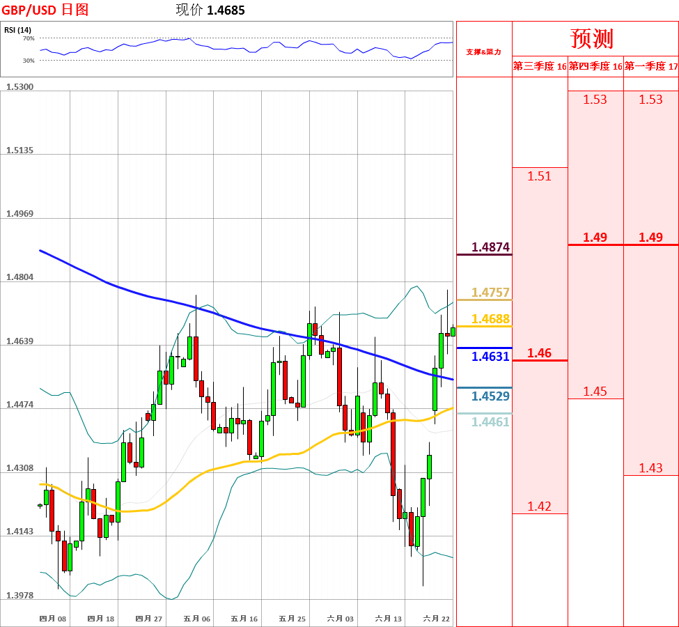 昨日,Survation民调结果显示,退欧支持率回升2%,英镑兑美元在创下年内新高之后,向下突破200日均线,收了带有长下影线的小阴线;目前,上方主要阻力位为昨日高点1.4784,下方主要支撑位为昨日低点1.4616。如果突破昨日高点,汇率将测试布林带上轨1.4806;但如果下破昨日低点,英镑兑美元将下探至5日均线1.4515附近。此外,日线动能指标开始超买,短期内有回调的可能性,但汇率仍旧跟着公投进展波动。今日开始全民退欧公投,投票于北京时间6月24日5:00结束。