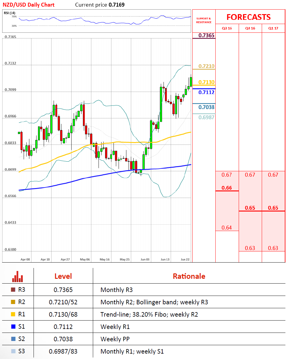 纽元/美元连涨六天,货币对正处于日线级别的上行通道中。目前货币对已经确定了通道上限在0.7152,而在那之后货币对也触顶反弹。如果下跌继续,下方目标则见周R1(0.7113)。不过技术指标则认为今天可能收平。