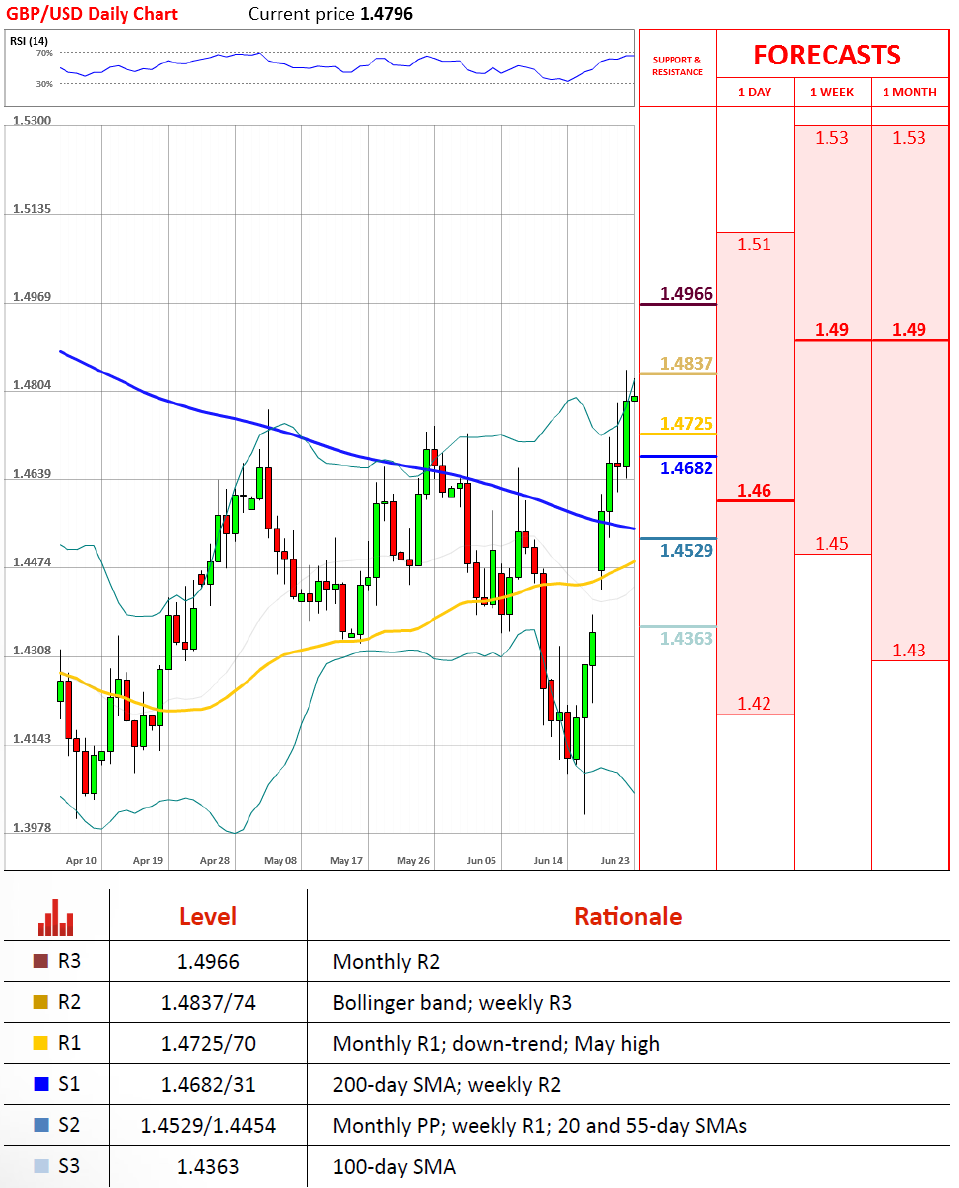 昨日,英镑兑美元突破200日均线之后,在年内高点附近遇阻回落,收了带有上影线的阳线。今日,汇率在亚盘时段创下年内新高,走势总体震荡偏多,上方关注布林带上轨1.4866阻力位,下方关注200日均线1.4671主要支撑位。此外,4小时技术指标偏多,但日线动能指标进入超买区域。今日开始退欧公投,明日公布结果。