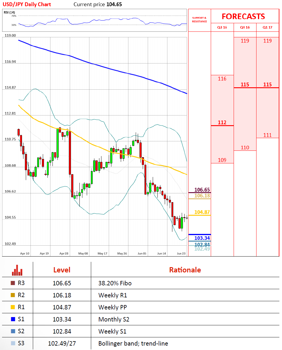 昨日,美元兑日元窄幅震荡于104.32至104.85之间,收了小阴线。汇率在近期不断地创年内新低之后,短期内存在技术性反弹的可能性,而且4小时、日线技术指标偏多,上方关注10日均线105.16阻力位,下方关注5日均线104.39支撑位。如果上破10日均线,汇率将会向布林带中轨靠拢;但如果下破5日均线,美元兑日元将再次创下新低。今明日关注英国退欧公投。