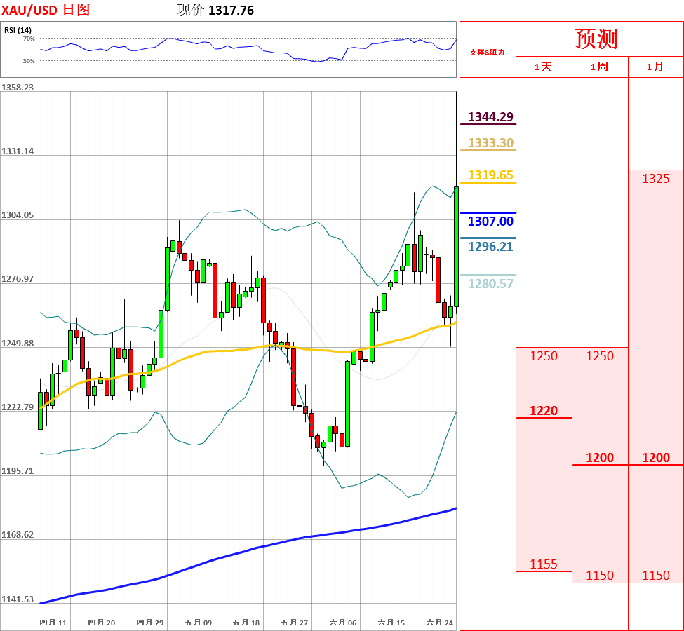 昨日,黄金延续了前两日的跌势,一度向下突破布林带中轨和55日均线,收了带有上影线的小阴线。今日,英国历史性地决定退欧,市场避险情绪高涨,作为主要避险投资的黄金,一度向上突破55日均线、布林带中轨和上轨,创下年内新高,涨幅超过8%。目前,价格出现回落,但预测黄金将继续上攻,上方主要阻力位为1350,下方关注5日均线1279.60支撑位。
