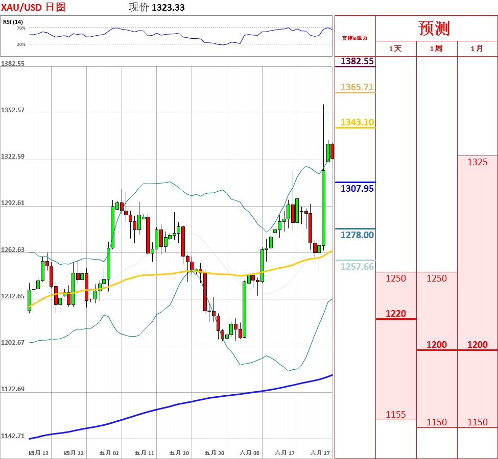 周五,市场避险情绪攀升,黄金一度向上突破55日均线、布林带中轨和上轨,随后震荡回调,收了带有长上影线的大阳线,周线收了带有长上下影线的中阳线,短期走势偏多。今日,上方关注1350主要阻力位,下方关注1310和1300主要支撑位。如果向上突破1350,价格有望测试1400关口;但如果在1350下方滞涨回调,黄金将测试1310和1300的支撑。此外,日线、4小时技术指标显示,价格存在继续上涨的动能。