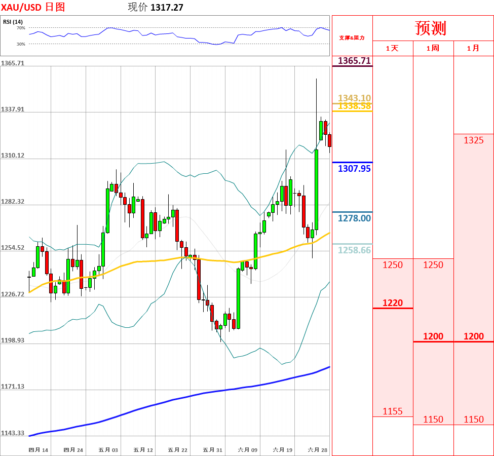 昨日,在市场避险情绪高涨的情况下,黄金窄幅震荡于1317.63至1335.29之间,收了带有上影线长于下影线的小阳线,趋势总体偏多。在英国退欧结果公布之后,美元大幅反弹,这对黄金形成了一定的压力。今日关注昨日高点1335.29阻力位和1310主要支撑位。如果向上突破昨日高点,价格将再次测试1350关口;但如若跌破1310,黄金将再次回归1300下方。此外,4小时动能指标显示,短期内黄金可能出现技术性回调。今日公布美国第一季度实际GDP终值及核心PCE物价指数终值。