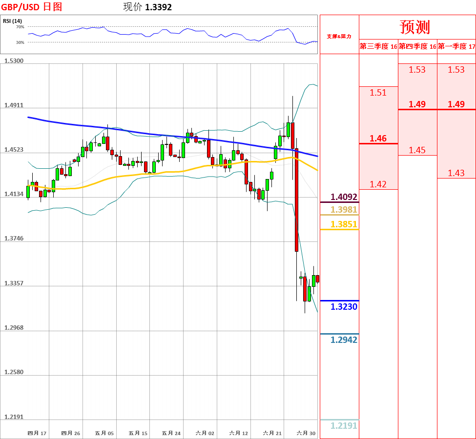 昨日,英镑兑美元在欧盘时段大幅拉升之后,美盘时分小幅回落,收了上影线长于下影线的阳线,目前处于技术性反弹过程中,但上方阻力重重,趋势仍旧偏空。今日关注昨日高点1.3533阻力位和低点1.3286支撑位。如果向上突破昨日高点,汇率将继续技术性反弹并且测试4小时布林带上轨1.3670的阻力;但如果下破昨日低点,欧元兑美元将再次开启空头趋势,第一支撑位为前日低点1.3202,第二支撑位为历史低点1.3121。此外,4小时动能指标再次转空,但日线动能指标超卖。今日公布英国第一季度经常帐和第一季度GDP年率终值。