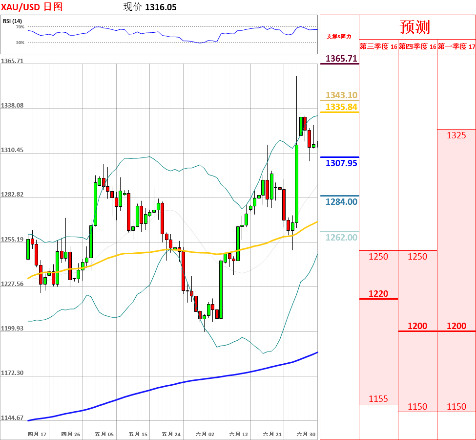 昨日,受到土耳其首都机场恐怖袭击的影响,黄金在亚盘、欧盘时分单边上涨,但涨至1327.80之后,小幅回落,收了带有上影线的光脚阳线。目前,虽然趋势偏多,但近期上影线过于平凡,有部分多头获利了结的迹象,今日上方关注昨日高点1327.80阻力位,下方关注1310主要支撑位。如果向上突破昨日高点,黄金将再次测试1335阻力位;但如果下破1310,4小时将形成双顶反转形态,而且可能再次回归1300下方。此外,4小时动能指标纠结,但日线动能指标开始慢慢拐头向下。今日公布美国至6月25日当周初请失业金人数。