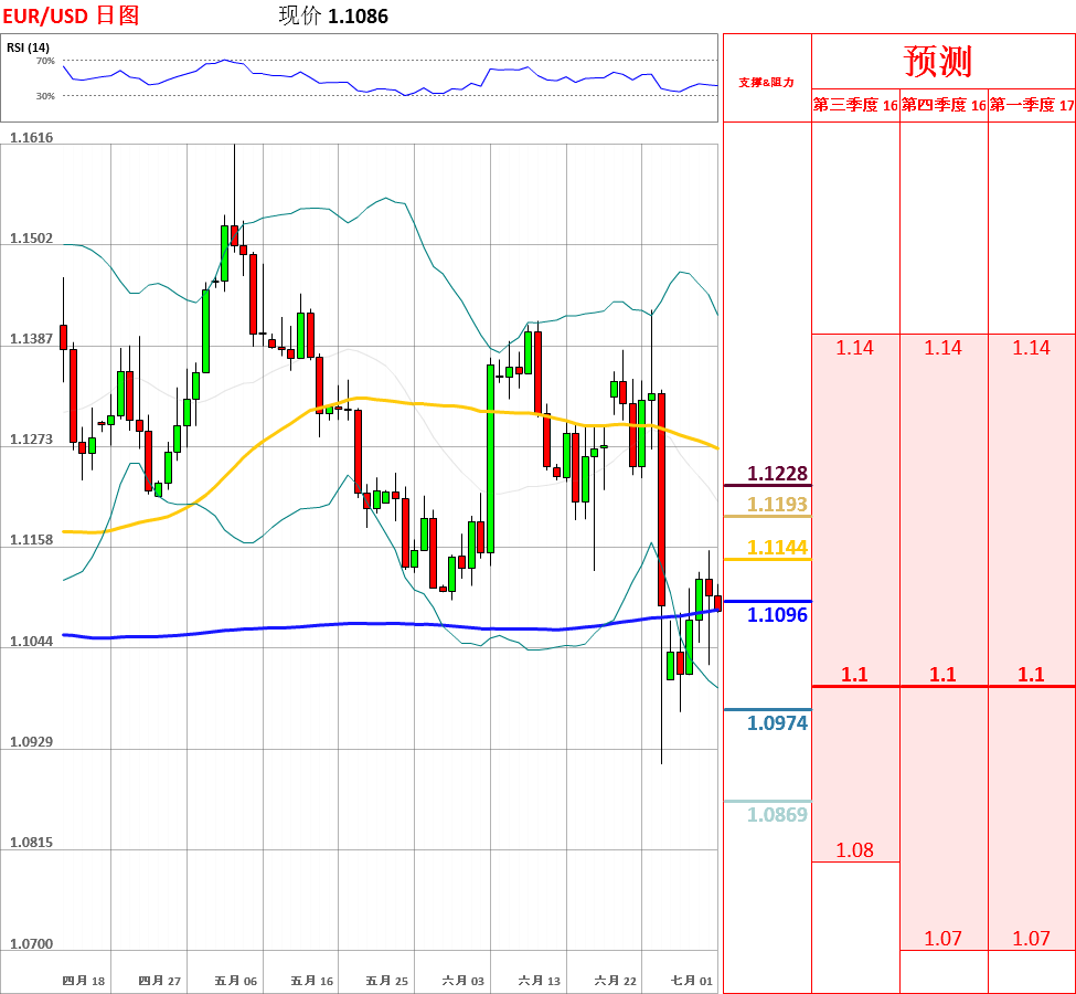 昨日,欧元兑美元在亚盘、欧盘时分单边上涨之后,美盘时段大幅下跌,随后小幅反弹,收盘于200日均线上方,收了带有长下影线的小阴线,有站稳200日均线的迹象。虽然趋势偏空,但目前处于技术性反弹过程中,今日上方关注昨日高点1.1154阻力位,下方关注200日均线1.1094支撑位。如果上破昨日高点,汇率将会向布林带中轨1.1200靠拢;但如若下破200日均线,欧元兑美元将再次测试周三低点1.1049。此外,日线、4小时技术指标显示,汇率存在继续反弹的动能。今日公布欧元区6月制造业PMI终值和5月失业率。
